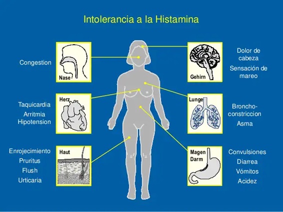 En gente sana, la histamina proveniente de la dieta es degradada rápidamente por la enzima Diamino Oxidasa (DAO), pero en personas con baja actividad de esta amina oxidasa se tiene el riesgo de sufrir lo que algunos referencian como histaminosis alimentaria o intolerancia a la histamina.
