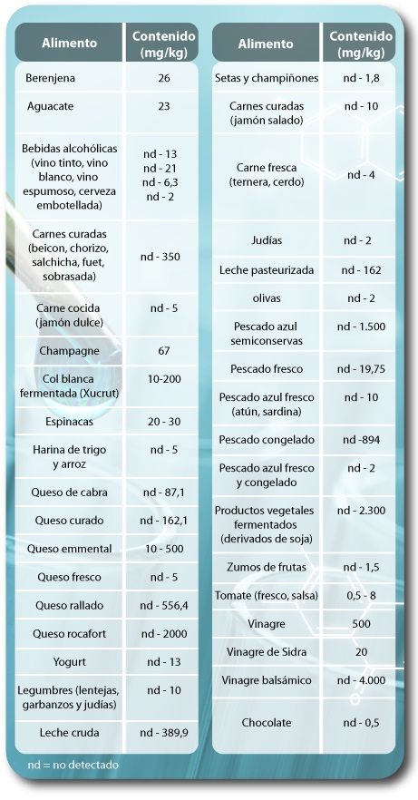 Se puede decir que se consideran susceptibles de presentar valores altos de histamina aquellos alimentos que se deterioran microbiológicamente con facilidad, como carnes y pescados, o alimentos y bebidas elaborados por fermentación o maduración.