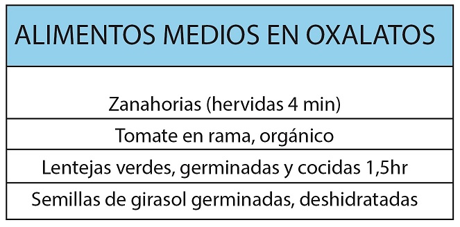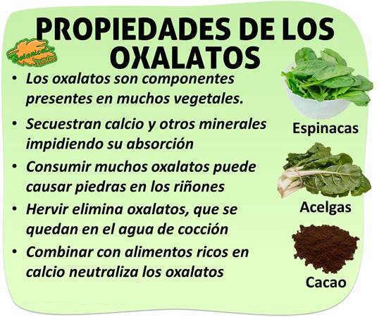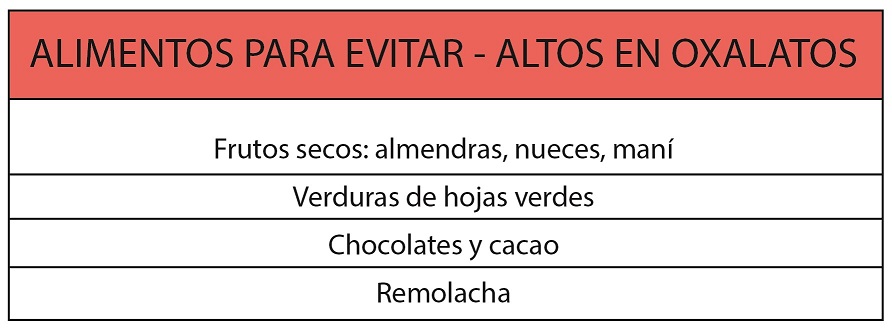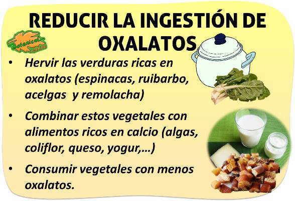 Los oxalatos se encuentran presentes en prácticamente todos los alimentos, por lo que se sugiere evitar los que contengan altas cantidades y utilizar los que tengan bajo o medio nivel de oxalatos.