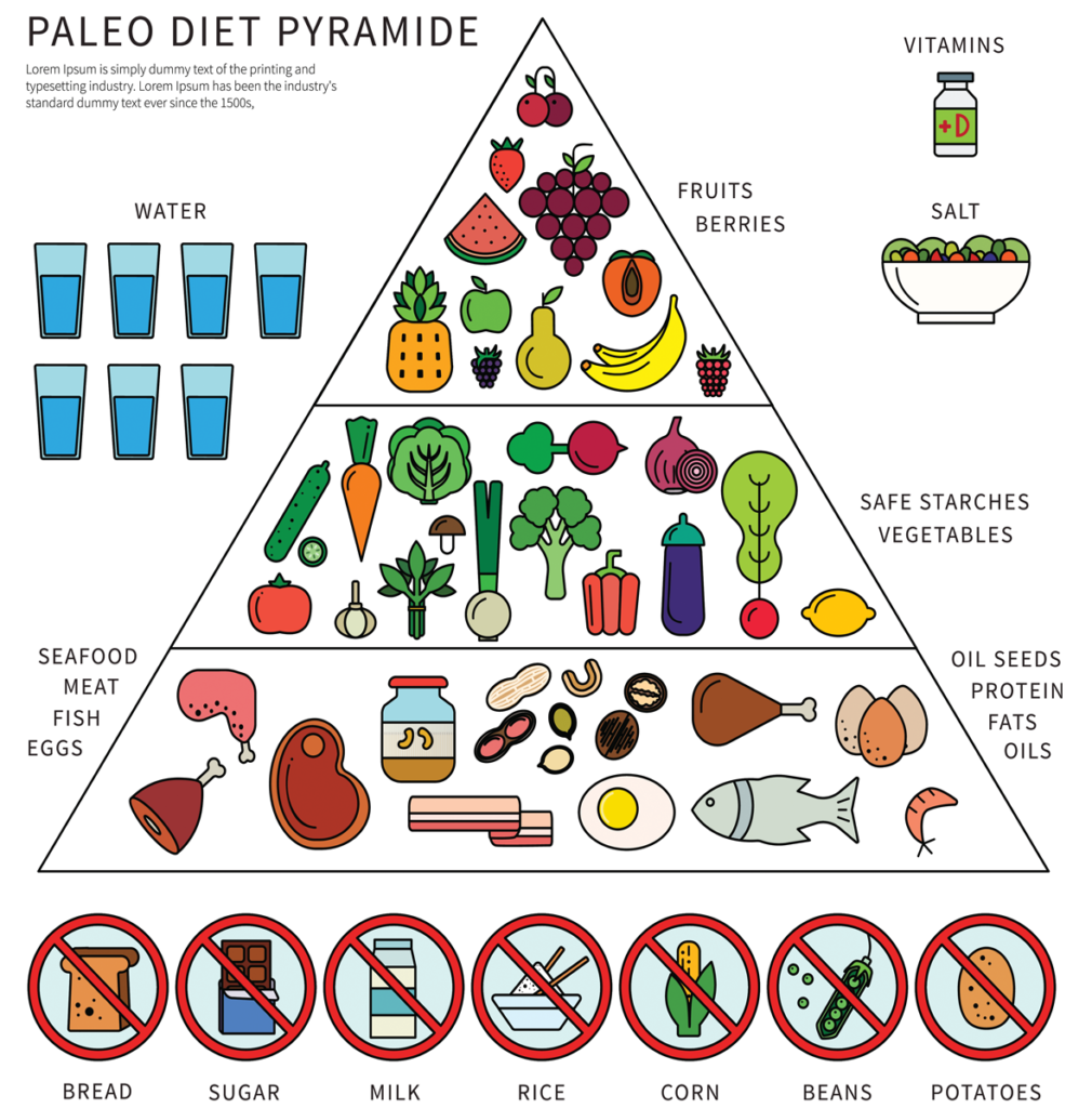 La dieta paleo suele incluir carnes magras,pescado, frutas, verduras, frutos secos y semillas, alimentos que en el pasado se podían obtener mediante la caza y la recolección. La dieta paleo limita los alimentos que se volvieron comunes cuando surgió la agricultura, hace unos 10.000 años. Estos alimentos incluyen productos lácteos, legumbres y granos.