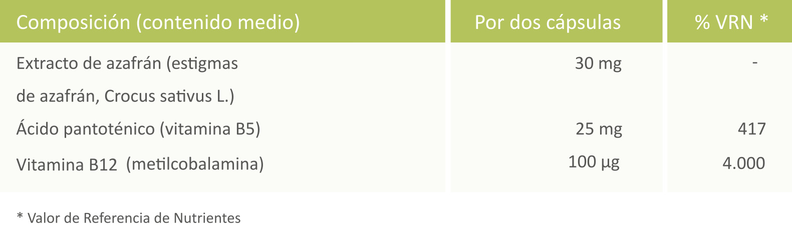 Complemento alimenticio con extracto de azafrán más ácido pantoténico y vitamina B12.
