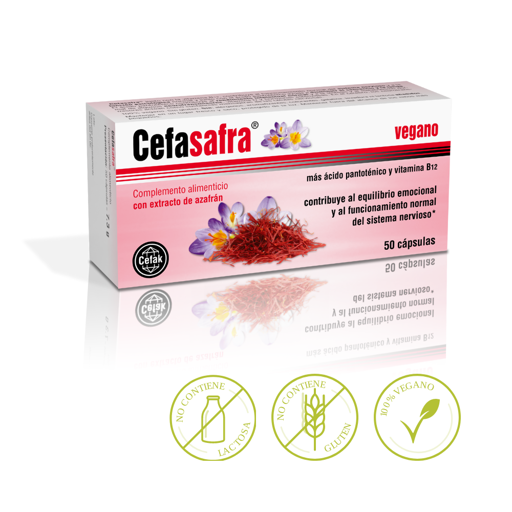 Cefasafra es un complemento alimenticio que contribuye al equilibrio emocional y al funcionamiento normal del sistema nervioso. Es un producto de alta calidad con extracto de azafrán y vitaminas B en altas dosis.