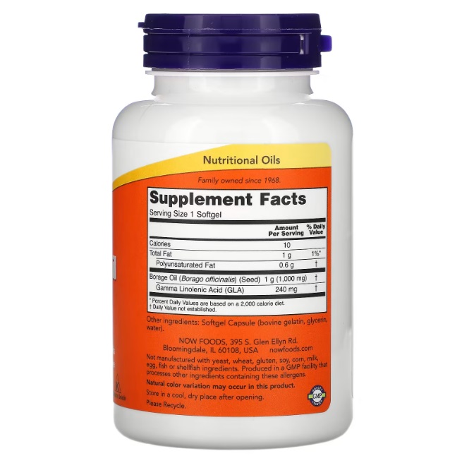El aceite de borraja es un aceite nutricional que consta de un 60% de grasas poliinsaturadas y aproximadamente el doble del contenido promedio de ácido gamma-linolénico (GLA) que el aceite de onagra. El GLA es un ácido graso esencial que el cuerpo puede producir a partir del ácido linoleico alimentario; sin embargo, se puede utilizar de manera más eficiente para las funciones corporales cuando se suministra directamente a través de fuentes alimentarias. Investigaciones han determinado que el aceite de borraja no tiene niveles dañinos de alcaloides de pirrolizidina (AP). El Aceite de borraja de NOW® está prensado con expulsor y sin hexano.