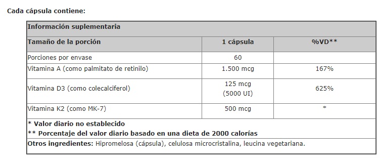 - Vitamina K2: La vitamina K2, o menaquinona (MK-7), es una forma especial de vitamina K importante para la formación ósea normal. La vitamina K2 activa una proteína esencial, llamada osteocalcina, que transporta e integra el calcio en los huesos. Un nivel óptimo de vitamina K2 garantiza que el calcio se deposite en los huesos en lugar de en las arterias. Esto significa que las arterias se mantienen blandas y flexibles para un flujo sanguíneo fluido.