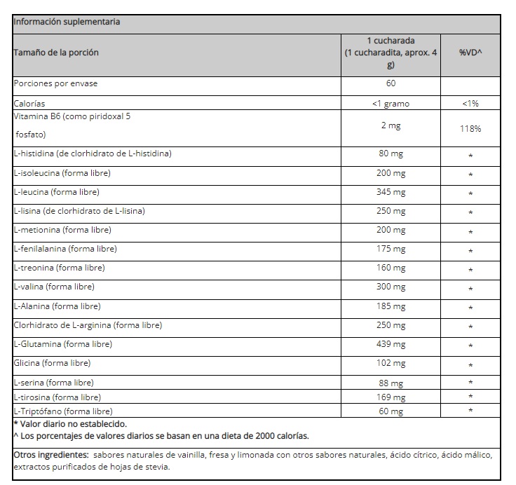 Ofrece una mezcla completa de aminoácidos libres, en las proporciones que se encuentran naturalmente en las fuentes de proteínas de alto valor biológico (VB). Mantiene el bienestar diario con aminoácidos esenciales que favorecen la síntesis proteica. Favorece el entrenamiento deportivo, incluyendo el rendimiento muscular, la producción de energía y la recuperación. Mejora la síntesis de neurotransmisores con precursores de aminoácidos para favorecer la función cognitiva y un estado de ánimo positivo. Promueve la función inmunitaria, en parte al favorecer unos niveles saludables de glutamina y glutatión.
