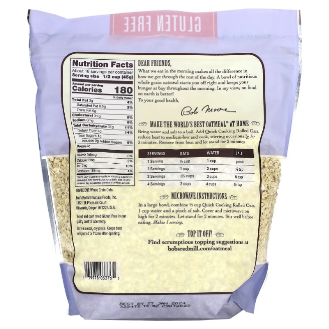 Nuestros copos de avena arrollados de cocción rápida sin gluten se adelgazan para acortar el tiempo de cocción, por lo que un sabroso tazón de avena integral está a solo unos minutos. Cada lote se maneja con cuidado en nuestras instalaciones dedicadas a productos sin gluten y se prueba en nuestro laboratorio de última generación para garantizar que se cumplan nuestros estrictos estándares de calidad sin gluten.