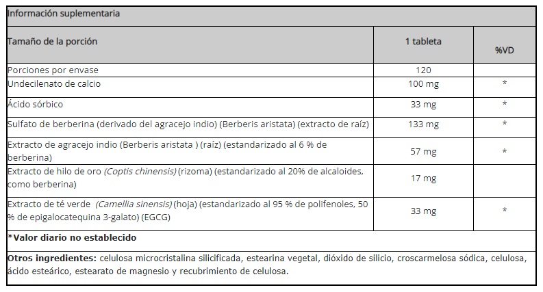 Esta potente fórmula combina agentes naturales específicos que inhiben el crecimiento de levaduras, hongos y otros microorganismos intestinales indeseables, favoreciendo así un equilibrio saludable de la microbiota intestinal. La berberina, un alcaloide presente en diversas plantas, posee diversas acciones metabólicas e inhibidoras. Los polifenoles del té verde pueden afectar negativamente la viabilidad de ciertos microorganismos y levaduras indeseables. El ácido undecilénico, aportado por el undecilenato de calcio, es un ácido graso monoinsaturado que inhibe la formación de hifas en las células de levadura, mientras que el ácido sórbico posee una reconocida acción inhibidora contra algunos microorganismos indeseables.