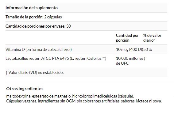 BioGaia Osfortis es un suplemento alimentario que contiene la bacteria del ácido láctico patentada Lactobacillus reuteri Osfortis ™ (L. reuteri ATCC PTA 6475) y vitamina D3. La vitamina D contribuye al mantenimiento de los huesos en condiciones normales.