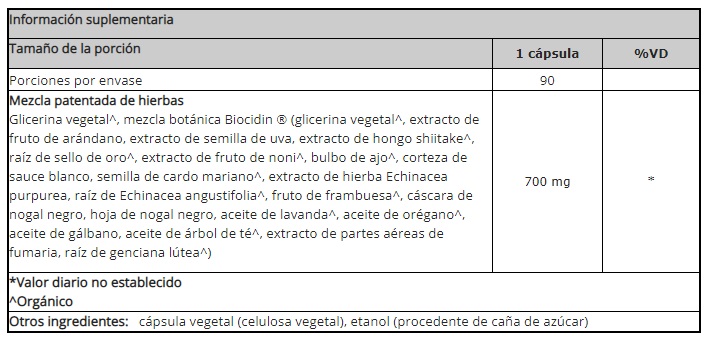 - Contiene la fórmula líquida Biocidin® en un sistema de administración de cápsulas.