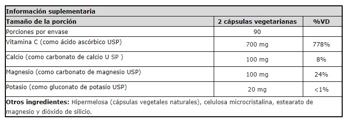 Este producto no contiene gluten, maíz, levadura, soja, lácteos, caseína, azúcar, colorantes ni saborizantes artificiales. Sin OGM.