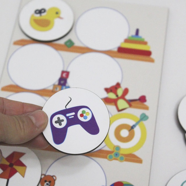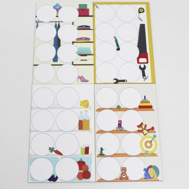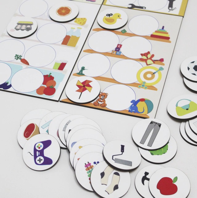 Cada cosa en su lugar es un juego que fue pensado para que los niños trabajen la discriminación visual a través de la clasificación y la categorización de objetos, ya sea un alimento, un juguete, una prenda de vestir o una herramienta, en el tablero que corresponde, incorporando también de esta forma vocabulario.