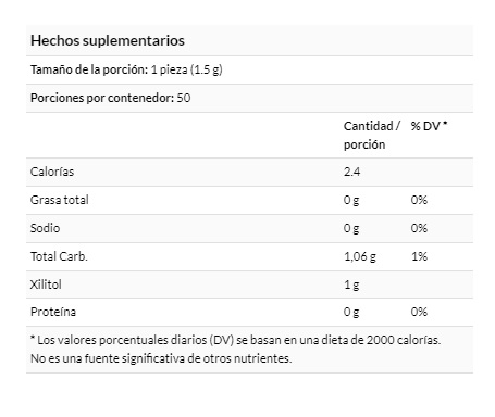 Xilitol, goma base, saborizantes naturales, lecitina de girasol, goma arábiga, carbonato de calcio, cera de carnaúba.
