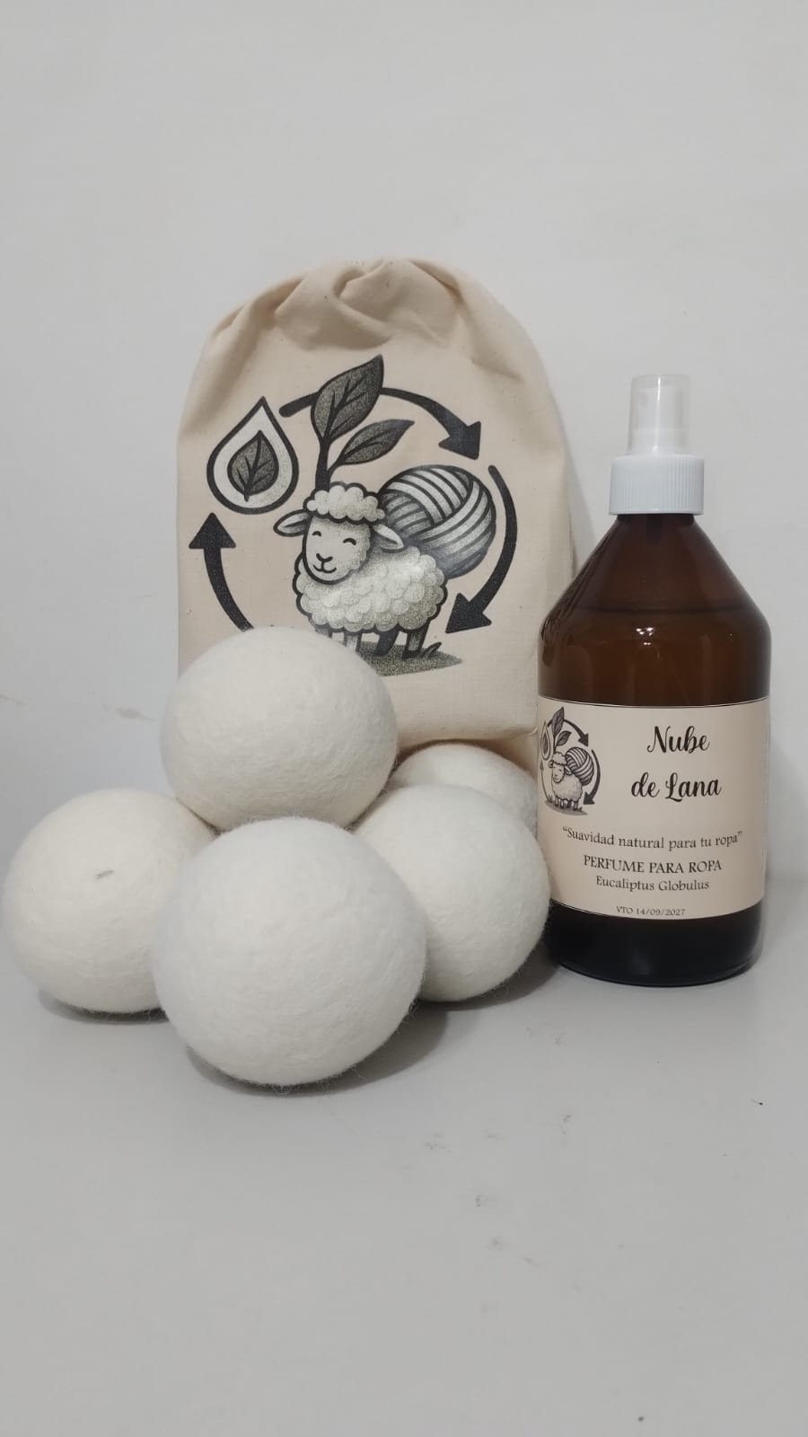 COMBO : Bolas de lana natural para Secadora (Pack x6) + Perfume para ropa x 500 ml Eucaliptus Globulus