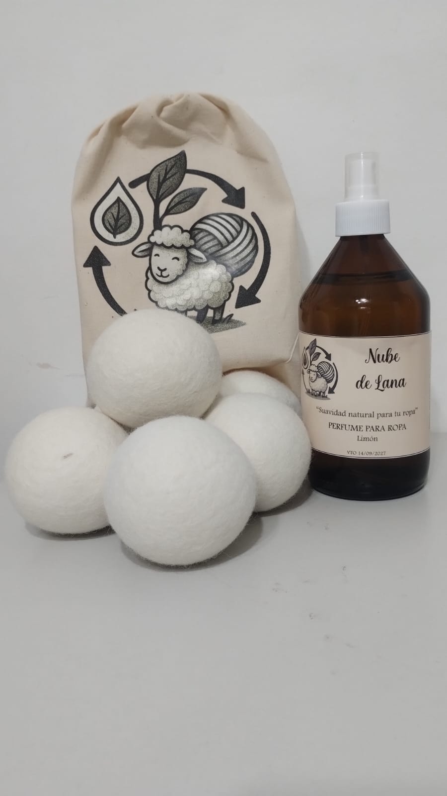 COMBO : Bolas de lana natural para Secadora (Pack x6) + Perfume para ropa x 500 ml Limón