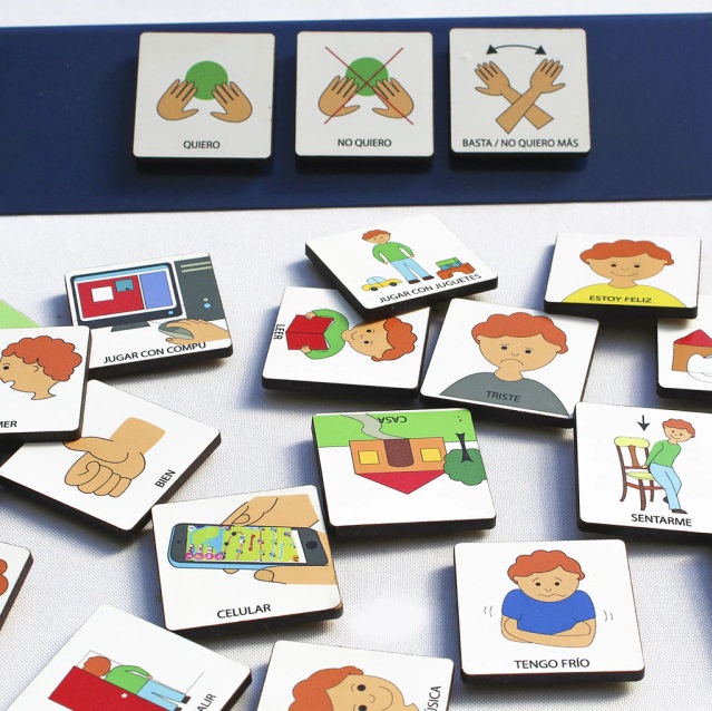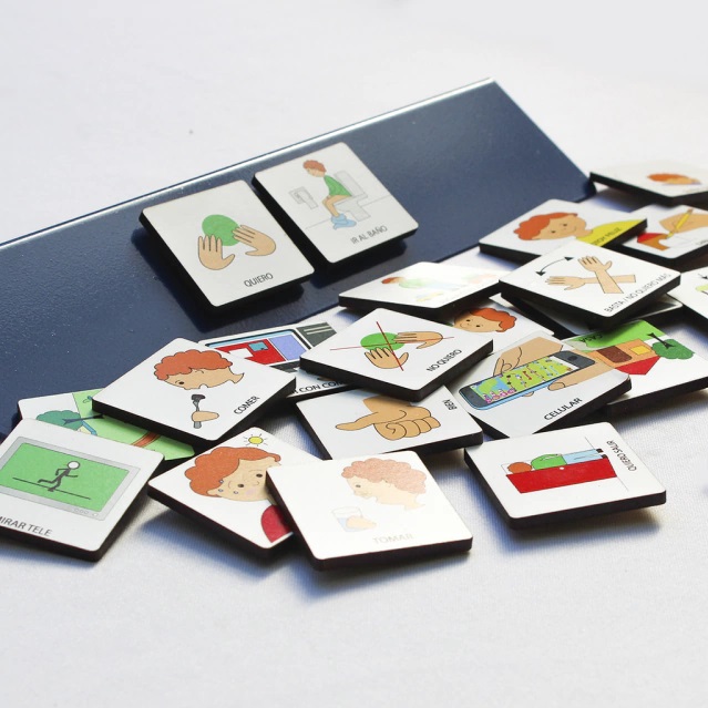 Comunicador ideal para transportar y poder llevar a cualquier lado. Este Comunicador portatil contiene 24 pictos de madera imantados y un atril metálico.