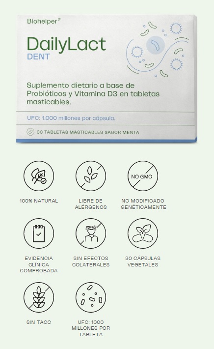 Una exclusiva fórmula probiótica que contribuye a restablecer el equilibrio de la microbiota oral. Ayuda a prevenir problemas bucales como la producción de placa dental, caries, halitosis, aftas (candidiasis oral) y la gingivitis.
