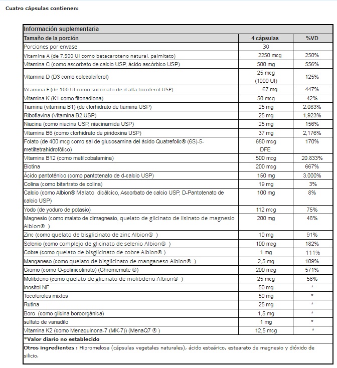 Este producto NO contiene gluten, soja, lácteos, caseína, azúcar, colorantes, conservantes ni saborizantes artificiales.