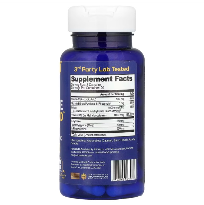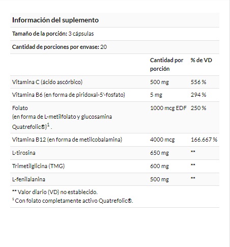No use este producto si tiene fenilcetonuria (PKU). Consulte con un profesional de la salud antes de tomar este suplemento nutricional o cualquier otro si está embarazada o lactando, tiene o sospecha que tiene una afección médica, toma algún medicamento (en particular, IMAO) u otros suplementos alimentarios que no sean de Natural Stacks®. No use el producto si falta el sello de seguridad o este está roto. Mantenga fuera del alcance de los niños.