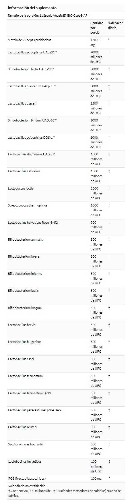 Celulosa microcristalina (fibra vegetal), cápsula vegetal (hipromelosa) (EMBO CAPS® AP), estearato de magnesio, sílice.