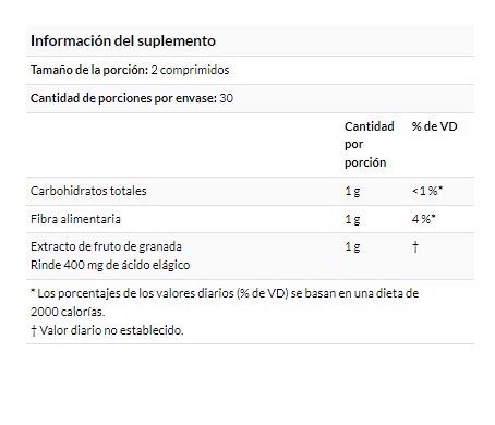 Las granadas son nativas de la zona entre Irán y el norte de la India. Es un fruto rojo rico y cargado de antioxidantes, vitaminas, potasio, ácido fólico y hierro. El extracto de granada de Source Naturals contiene un mínimo de 400 mg de ácido elágico. Estudios preliminares de laboratorio han demostrado que el ácido elágico es un poderoso antioxidante que refuerza la integridad del ADN y promueve la salud celular en general.