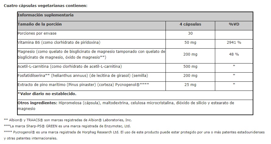 Acetil-L-Carnitina : Un nutriente importante derivado de los aminoácidos tirosina y metionina, que ayuda al cuerpo a convertir los ácidos grasos en energía. Se necesitan cantidades adecuadas de L-Carnitina o Acetil-L-Carnitina para la síntesis de DHA (presente en el aceite de pescado), que es fundamental para el buen funcionamiento del cerebro. Las investigaciones han demostrado una relación entre los niveles plasmáticos bajos de carnitina y los problemas de conducta.
