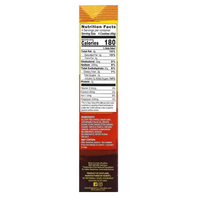 Avena integral sin gluten, aceite de palma sustentable, azúcar moreno, tallo de jengibre (tallo de jengibre, azúcar), almidón de tapioca, jengibre molido, levadura (bicarbonato de amonio, bicarbonato de sodio), azúcar invertido, sal marina.