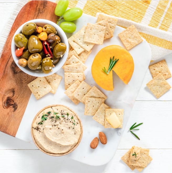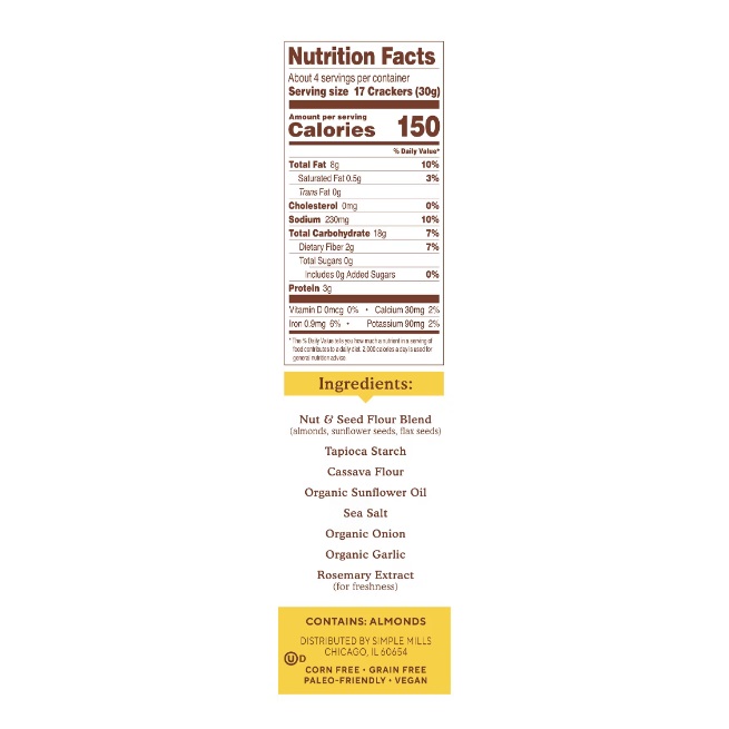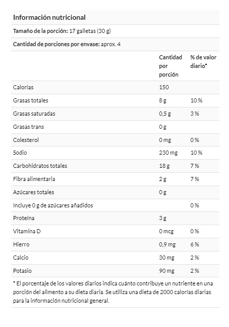 Mezcla de harina de frutos secos y semillas (almendras, semillas de girasol, semillas de lino), almidón de tapioca, harina de yuca, aceite de girasol orgánico, sal marina, cebolla orgánica, ajo orgánico, extracto de romero (para conservar la frescura).