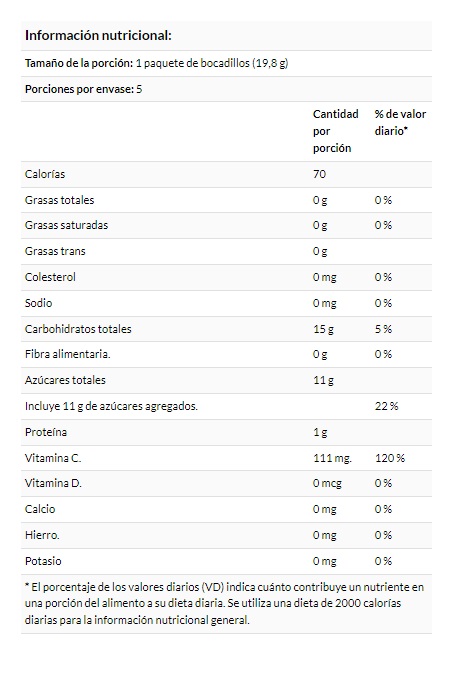 Jarabe de arroz orgánico, azúcar de caña orgánico, gelatina, concentrado de zumo de manzana, ácido cítrico, ácido ascórbico, saborizantes naturales, colorantes con concentrado (zanahoria, grosella negra, Manzana, calabaza, rábano, limón, páprika), cera de carnaúba orgánica, aceite de girasol orgánico.