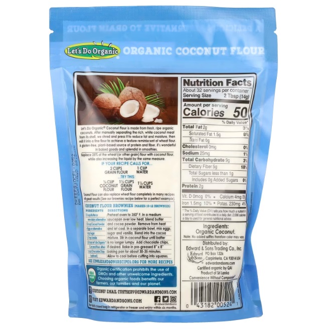 La Harina de coco de Let’s Do Organic® está elaborada con cocos orgánicos frescos y maduros. Después de separar manualmente la rica pulpa blanca del coco de su cáscara, la trituramos y la prensamos para reducir la grasa y la humedad. Luego, la molemos hasta obtener una harina fina para lograr una textura que recuerda a la harina de trigo. Es una fuente de proteína y fibra de origen vegetal sin gluten que es maravillosa en alimentos horneados y espléndida en batidos.