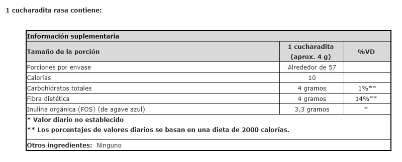 La inulina, un fructooligosacárido (FOS), es una fibra prebiótica soluble resistente a la digestión que llega al intestino grueso prácticamente intacta. Las bacterias probióticas intestinales la consumen y, a su vez, producen los ácidos grasos de cadena corta que nutren las células que recubren el colon. Por lo tanto, la inulina contribuye a mantener la salud y la función intestinal. La inulina tiene un sabor agradable que aporta un ligero dulzor a alimentos y bebidas, pero tiene un índice glucémico muy bajo y no afecta negativamente los niveles de glucosa sérica.