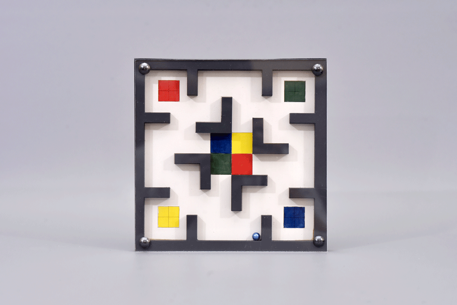 Un tablero de madera y acrílico, con una bolita en medio, nos permite realizar recorridos de partida y llegada atravesando obstáculos.