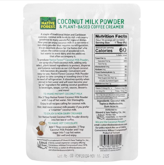 Para producir Leche de coco en polvo Native Forest®, secamos por atomización leche de coco fresca y agregamos solo ingredientes de origen vegetal seleccionados para proteger, dispersar y equilibrar los nutrientes a medida que nuestra rica leche de coco líquida se convierte en polvo seco. La Leche de coco en polvo de Native Forest, práctica y fácil de usar, es ideal para llevar de campamento o de viaje, ya que no necesita refrigeración. Se disuelve rápidamente cuando se revuelve en agua caliente y pronto se convertirá en su ingrediente favorito para agregar las bondades del coco a bebidas, sopas, curris, salsas, postres… ¡y más!