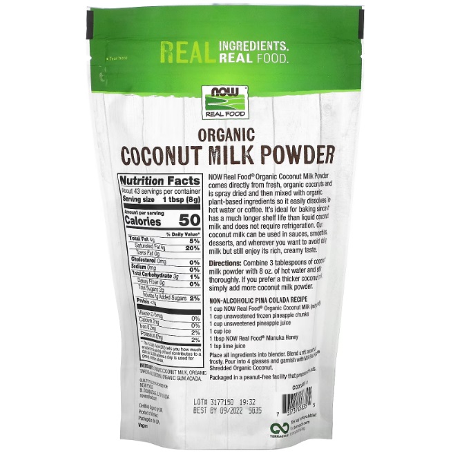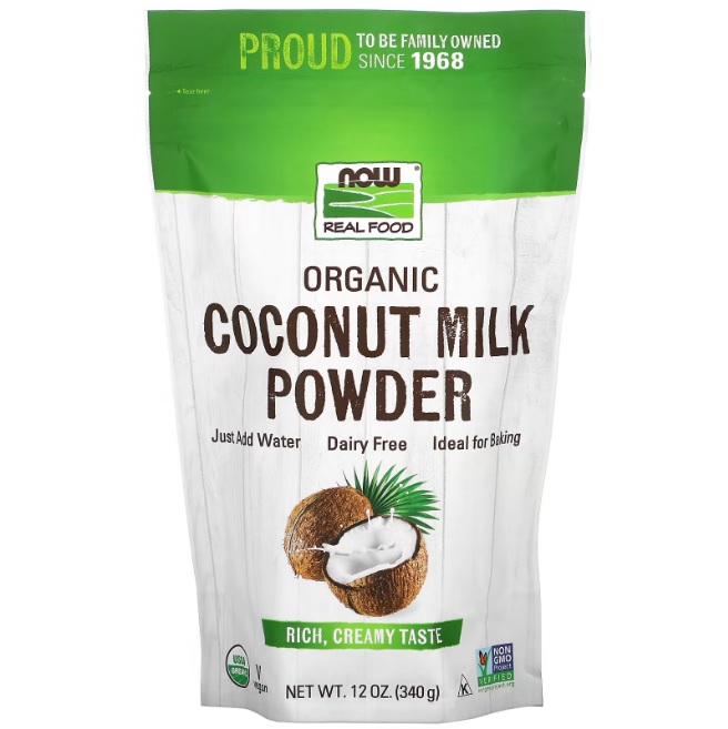 La leche de coco orgánico en polvo de NOW Real Food® proviene directamente de cocos orgánicos frescos y se seca por aspersión y luego se mezcla con ingredientes orgánicos de origen vegetal para que se disuelva fácilmente en agua caliente o café. Es ideal para hornear, ya que tiene una vida útil mucho más larga que la leche de coco líquida y no requiere refrigeración. Nuestra leche de coco se puede utilizar en salsas, batidos, postres y en cualquier lugar donde quiera evitar la leche de vaca, pero aún así disfrutar de su rico y cremoso sabor.