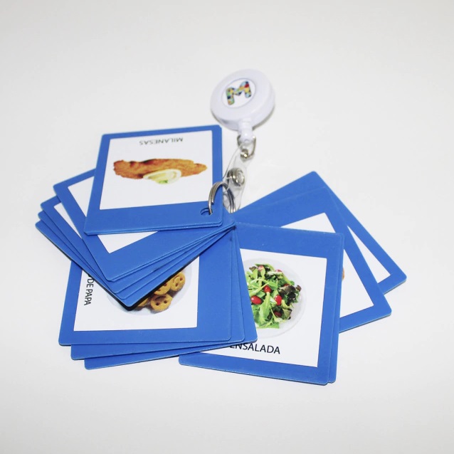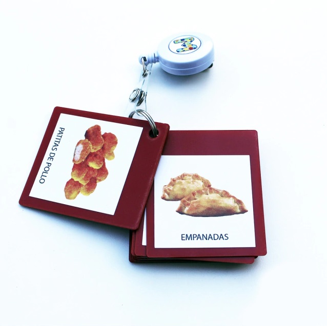 Qué querés comer hoy? Quizá una pregunta simple, pero para nuestros niños un desafío, con este llavero te ayudamos a que nos cuenten que quieren comer. Contiene 15 fotografías de ensalada, hamburguesa, papas fritas y huevo frito, pollo, pancho, pizza, fideos largos, sopa, caritas de papa, tarta de verdura, patitas de pollo, carne con papas, milanesas, omelette, empanadas.
