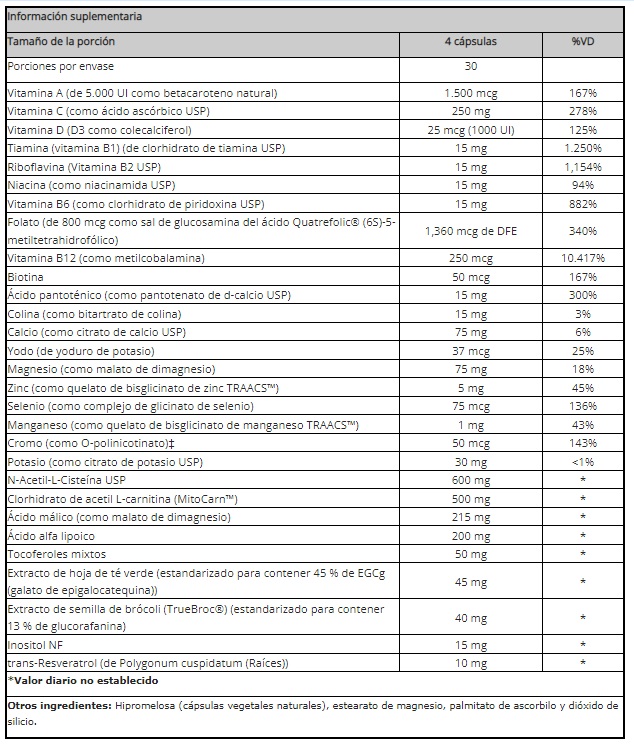 Mito-Mate Daily está formulado científicamente, con base en investigaciones publicadas, para aumentar las reservas mitocondriales y revitalizar la producción de energía celular. Mito-Mate Daily incluye el potente trío antioxidante de ácido alfa lipoico, N-acetil cisteína y acetil L-carnitina, que ha demostrado revitalizar la producción de energía celular y las principales reservas antioxidantes celulares de vitaminas E, C y glutatión. También incluye micronutrientes y fitonutrientes clave, como té verde, extracto de semilla de brócoli y resveratrol, para proteger las mitocondrias y renovar continuamente el ciclo de producción de energía.