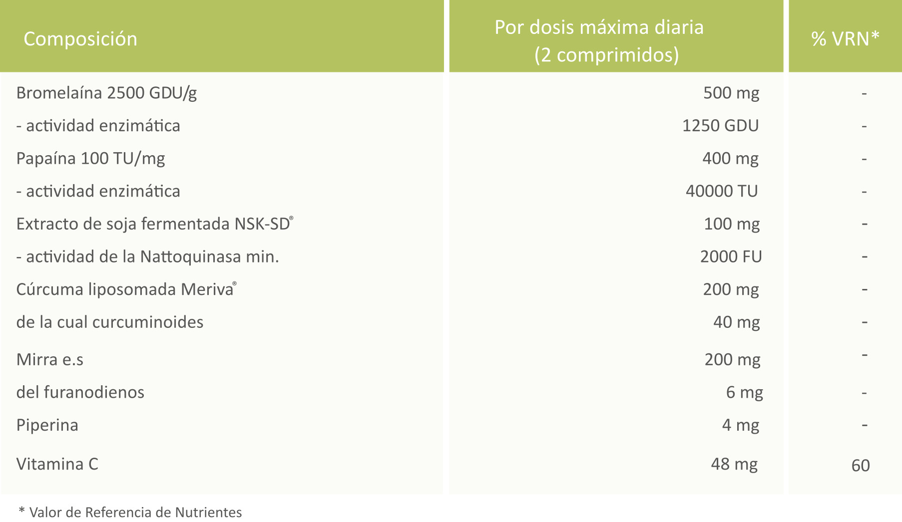 Agente de carga: celulosa; Bromelaína de Piña (Ananas comosus (L.) Merr., Tallos) 2500 GDU/g; Papaína en polvo (de Carica papaya L.) 100 TU/mg; agente de carga: fosfato dicálcico; Cúrcuma liposomada Meriva® (20% curcuminoides de rizomas de Curcuma longa L., fosfolípidos de girasol), Mirra (Commiphora myrrha (Nees) Engl) oleo-goma-resina e.s. tit. 3% en furanodienos; antiaglomerantes: mono y diglicéridos de ácidos grasos; extracto de soja fermentada NSK-SD® (actividad Natoquinasa 20000-28000 FU/g), antiaglomerante: dióxido de silicio; vitamina C (ácido L-ascórbico); antiaglomerantes: carboximetilcelulosa sódica reticulada, sales magnésicas de ácidos grasos; Piperina de Pimienta negra (Piper nigrum L.) frutos e.s. tit. 95% en piperina; agentes de recubrimiento: etilcelulosa, ácidos grasos, alginato de sodio; triglicéridos de cadena media.