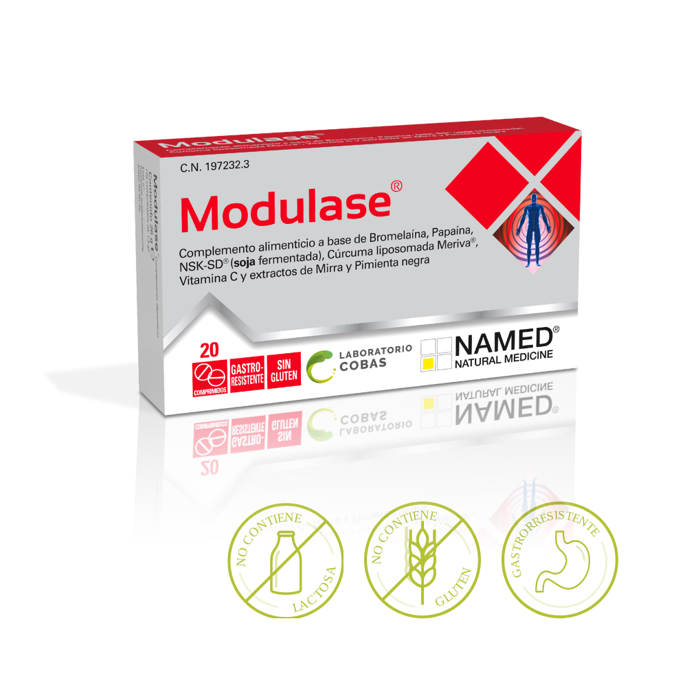 Complemento alimenticio a base de Bromelaína, Papaína, NSK-SD® (soja fermentada, Nattoquinasa), Meriva® (Cúrcuma fitosomada), Vitamina C y extractos de Mirra y Pimienta negra