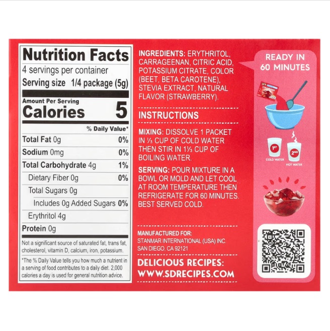 Eritritol, carragenano, ácido cítrico, citrato de potasio, colorante natural (remolacha, beta-caroteno), saborizante natural (fresa), extracto de estevia.