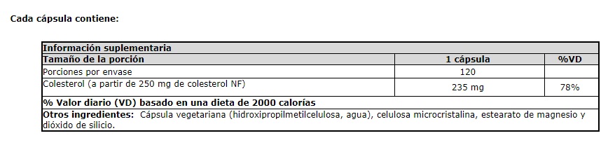- Cada cápsula contiene 250 mg de colesterol.