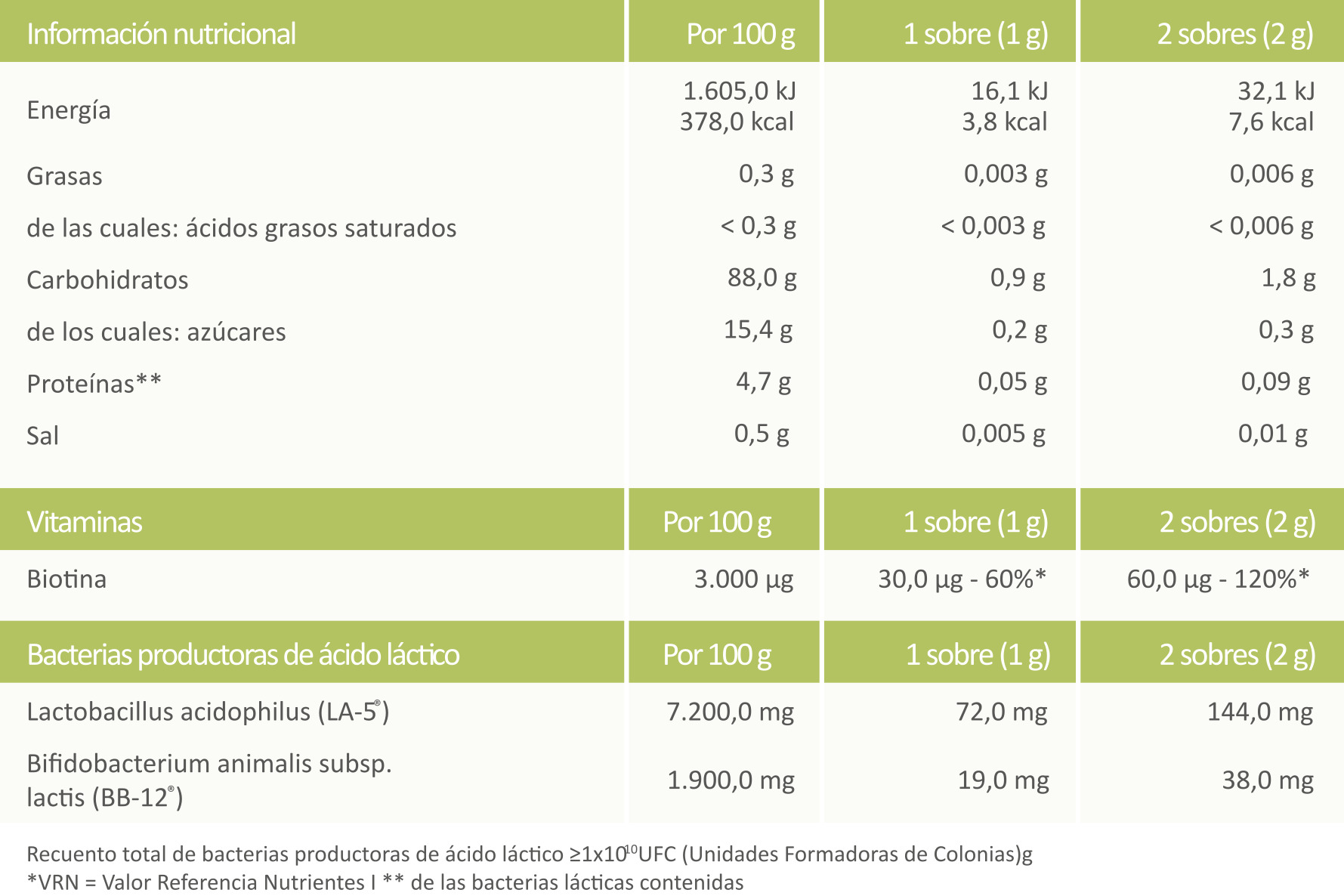 Inulina, maltodextrina, bacterias productoras de ácido láctico Lactobacillus acidophilus (LA-5®), Bifidobacterium animalis subsp. lactis (BB-12®), antiaglomerante dioxido de silicio, biotina.