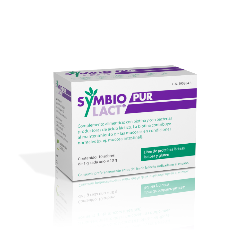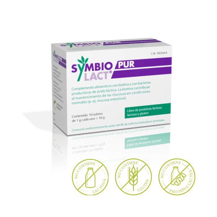 SymbioLact® PUR es un probiótico libre de proteína láctea, lactosa y gluten con bacterias productoras de ácido láctico – Lactobacillus acidophilus (LA-5®) y Bifidobacterium animalis subsp. lactis (BB-12®) que contribuyen al mantenimiento de la salud intestinal.
