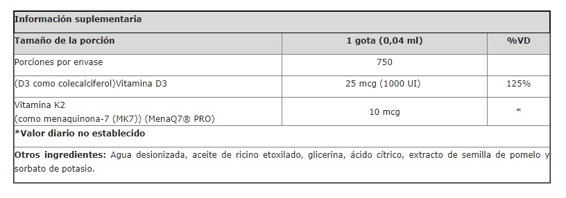 La vitamina D3 líquida con K2 incluye 10 mcg de MenaQ7® PRO , la forma más estudiada de vitamina K2 (MK-7), y 1000 UI de vitamina D3 por porción. Su fórmula líquida sin sabor se puede combinar fácilmente con cualquier bebida.